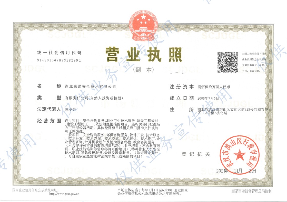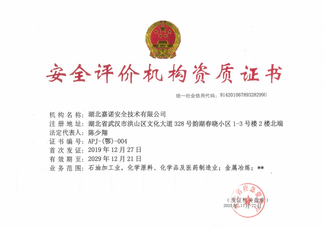 湖北嘉诺安全技术有限公司属于专业的安全技术服务机构,总部坐落于人杰地灵、风景优美的江城-武汉,成立于2006年,是国内首批获得安全评价资质的机构之一,安全评价资质证书编号:APJ-(鄂)-004,安全评价业务范围有:一般工贸行业;石油加工业、化学原料、化学品及医药制造业;金属冶炼。安全咨询业务范围有:安全管家服务、工伤预防培训、应急预案编制指导、试生产方案编制指导、双重预防机制建设、隐患排查、多米诺效应分析、外部安全防护距离分析以及企业委托的专项风险评价等。
